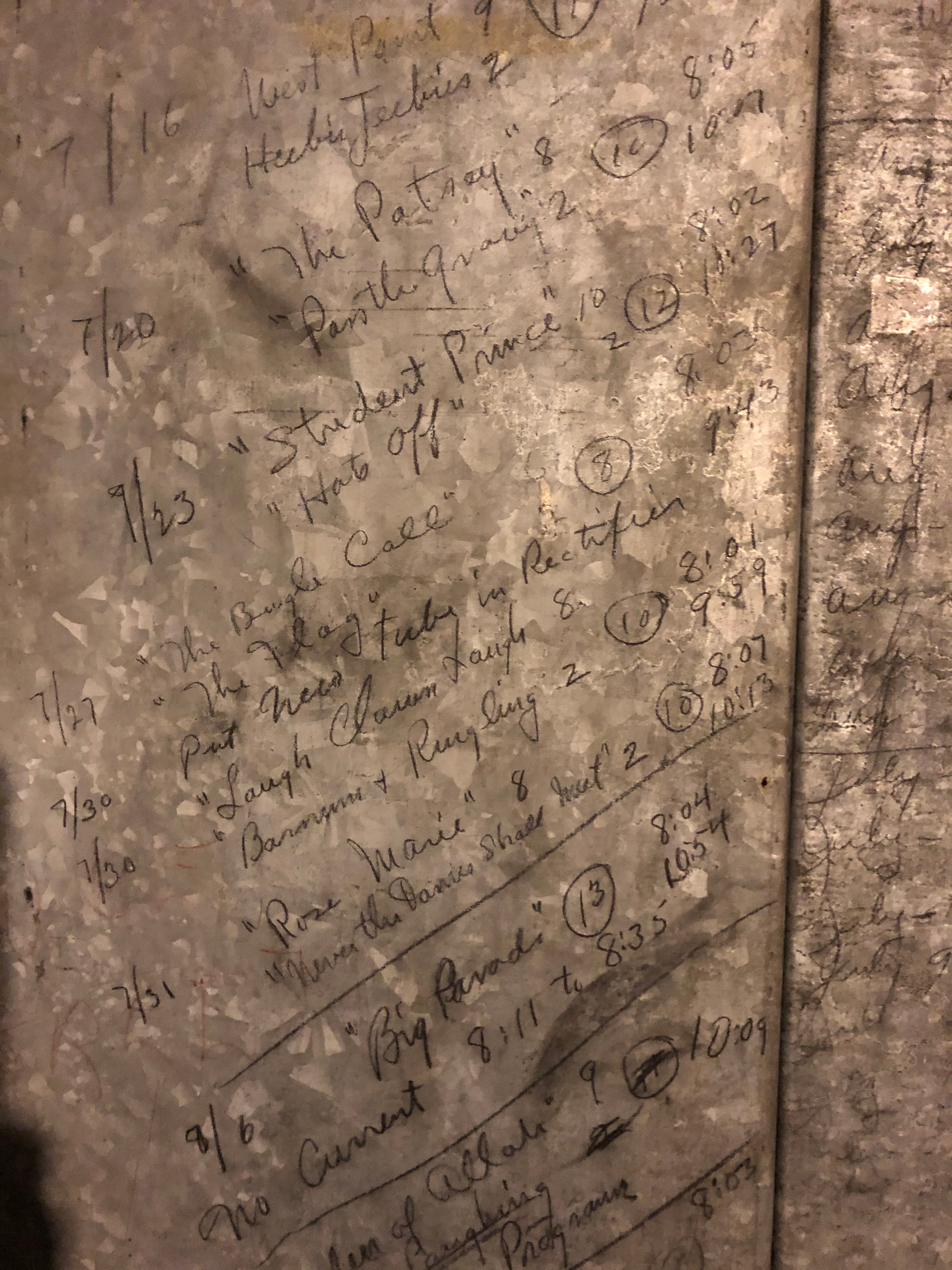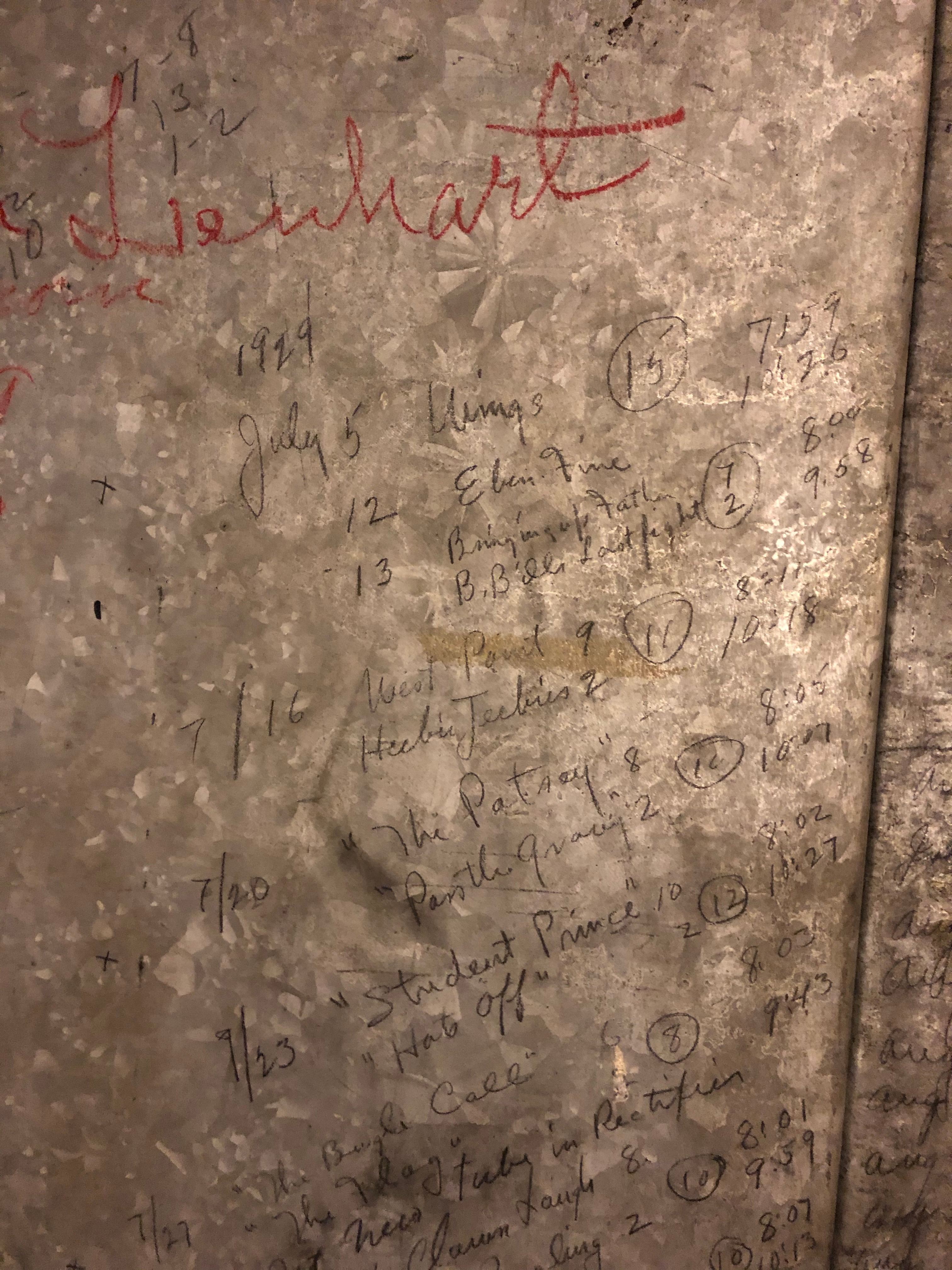 John Templeton thinks that the large, red "Lienhart" written at the top was probably the name of the projectionist that year, whose handwriting we're looking at.